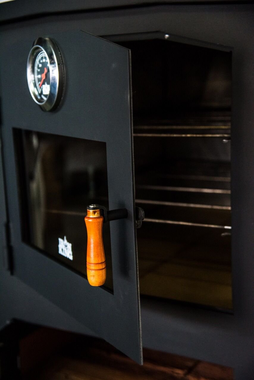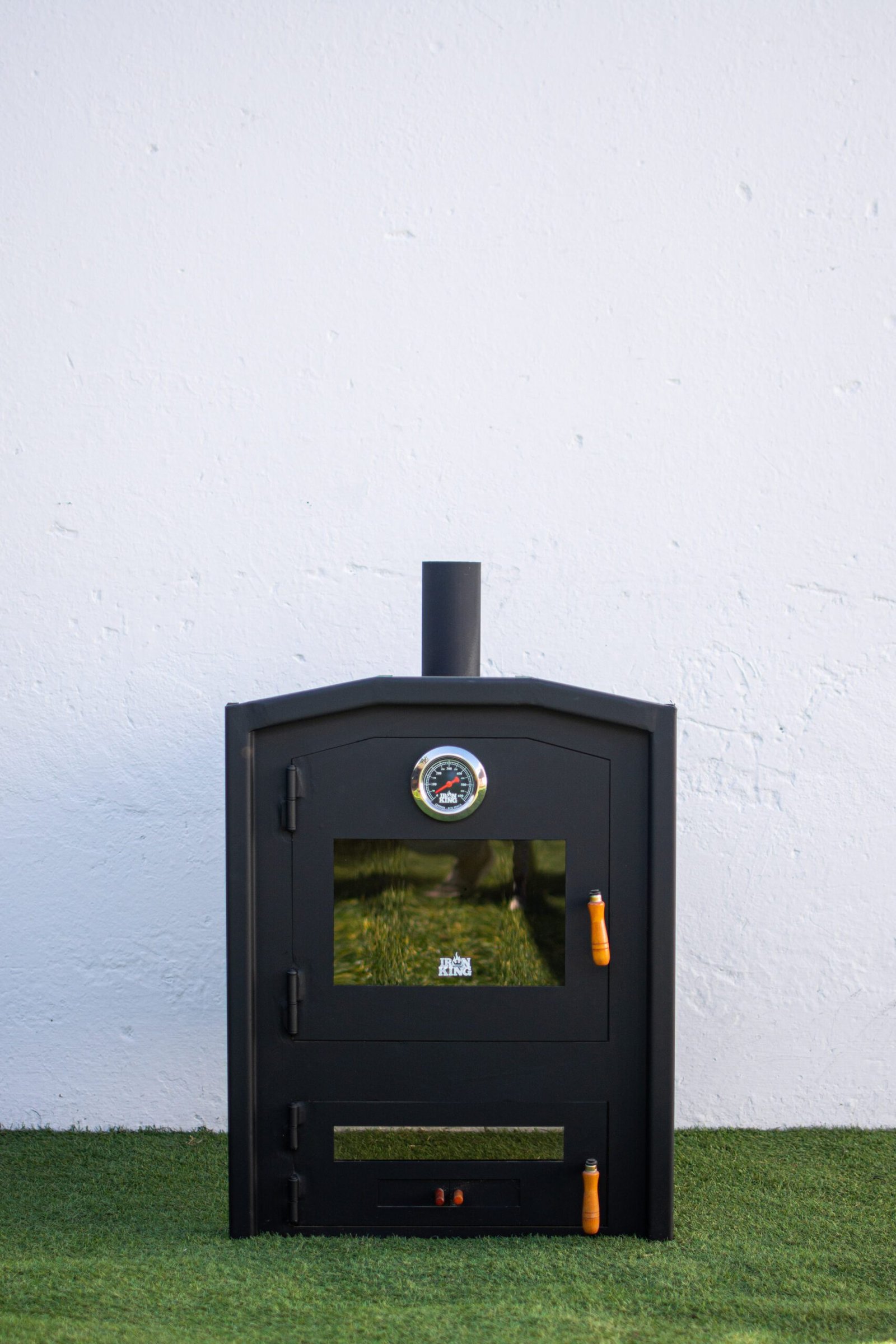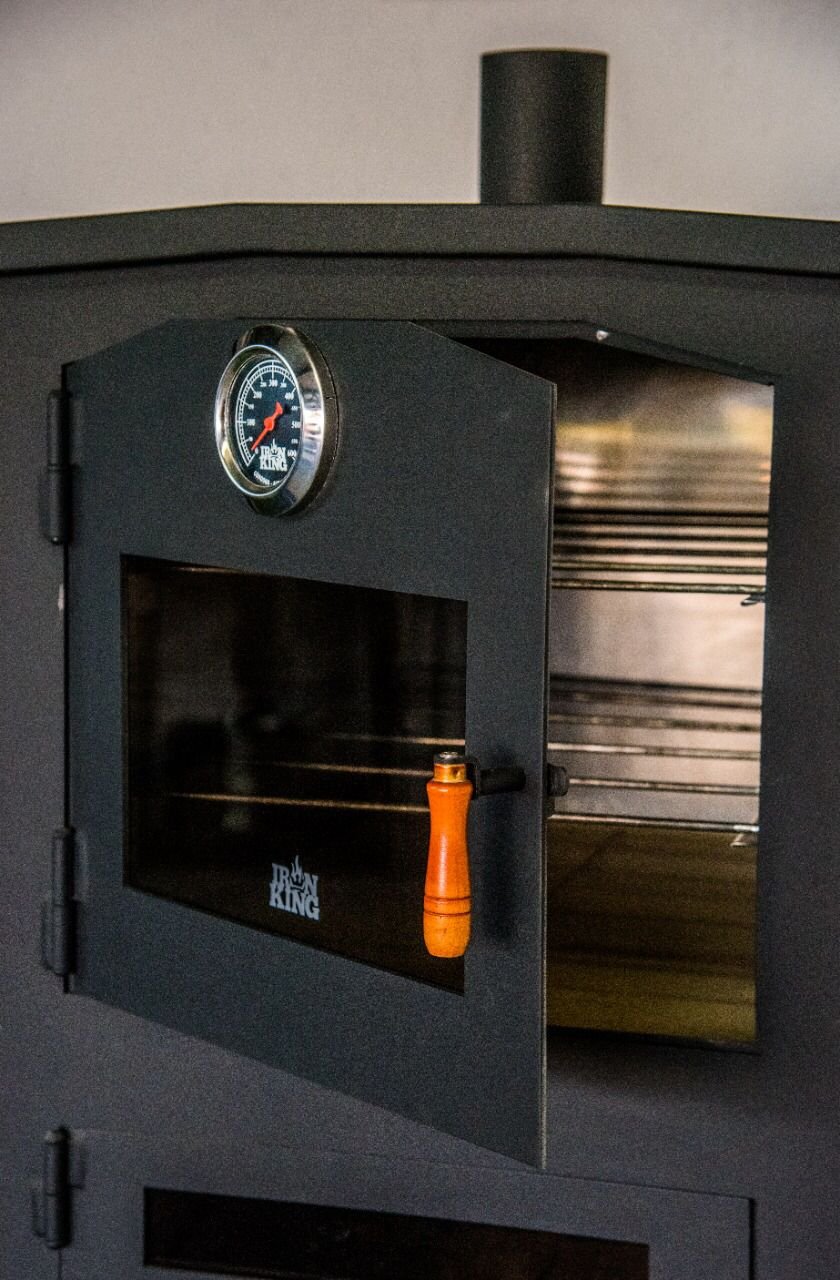 Fabricado en hierro de alta resistencia, este horno combina tradición y durabilidad para cocinar al fuego con sabor auténtico. Su diseño vertical incluye tres compartimentos funcionales: cámara de cocción con visor y termómetro, cámara de fuego con puerta de vidrio templado, y base con ventilación regulable. Las manijas de madera aportan un toque cálido y seguro. Ideal para pan, pizza, carnes y todo lo que merece cocción lenta y envolvente.